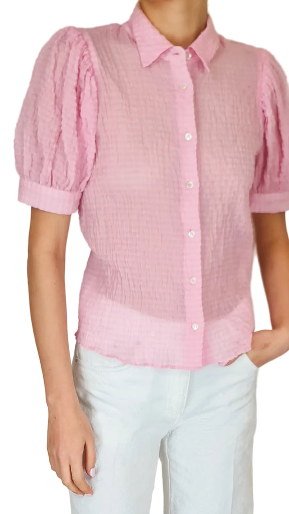 The design is defined by feminine puff sleeves with gathered detailing and a classic pointed collar, while the semi-sheer quality lends an ethereal touch to the structured button-down silhouette. It is an effortless statement piece that perfectly balances vintage-inspired aesthetics with modern luxury.