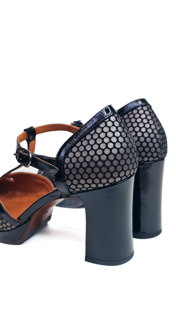 Featuring a striking yet classic print that adds a unique flair, these Chie Mihara shoes are further elevated by the sleek patent effect on leather, providing a sophisticated shine. The classic black and grey colour makes them a versatile addition to any wardrobe, perfect for both formal occasions and stylish everyday wear. Combining artistry with comfort, these shoes are designed to make a confident statement wherever you go.