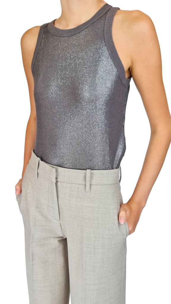 This Purotatto top in dark silver with undertones of hazelnut brown, is your go-to for adding a touch of shimmer to any outfit. Whether layered under a blazer for a polished party look or worn solo to brighten casual styles, this fine tank top offers versatile elegance. Its subtle shine brings fun and sophistication, making it perfect for both special occasions and everyday flair.