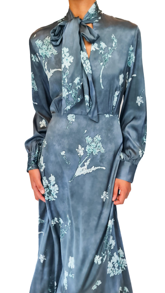 Elevate your style with this Caliban dress, featuring a stunning floral print in a rich teal shade. Its silky texture offers a luxurious feel, while the elegant tie-neck detail adds a refined touch. Perfect for any occasion, this dress combines comfort and sophistication effortlessly.