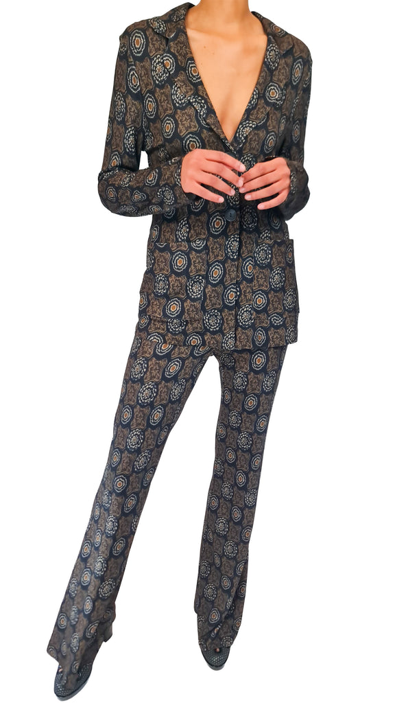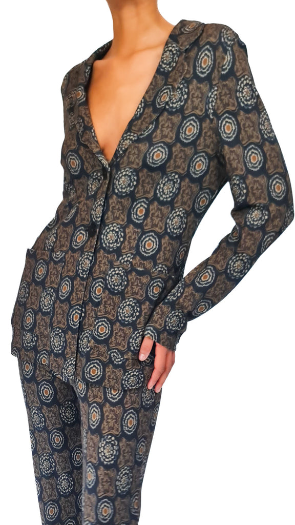 This versatile unconstructed blazer in black and brown features a subtle soft geometric print, adding a modern edge to a classic silhouette. Its lightweight design offers comfort and effortless style, perfect for both professional and casual settings. Pair it with the matching trousers for a sleek, coordinated suit look that stands out with understated sophistication.