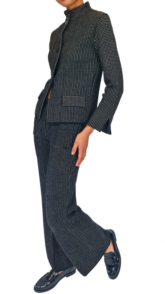 This classic SIYU jacket combines timeless style with cozy comfort. Crafted from 100% merino wool, it offers exceptional warmth while featuring a stylish black and beige dot print. Its sharp cropped fit makes it perfect for pairing with matching trousers to create a coordinated suit look. Elevate your wardrobe with this versatile blazer that blends refined design and luxurious softness effortlessly.