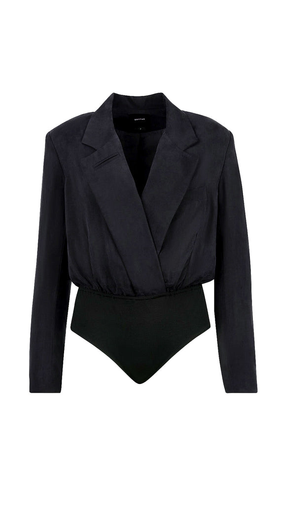 A tucked in blazer is one of this season's favourite looks. A relaxed silhouette, this new blazer bodysuit features a strong shoulder, wide lapel with an exaggerated welt detail and a thong-cut bottom. This soft black bodysuit offers the look without the bulk. The drapey cupro fabric is seasonless and suitable for all climates.