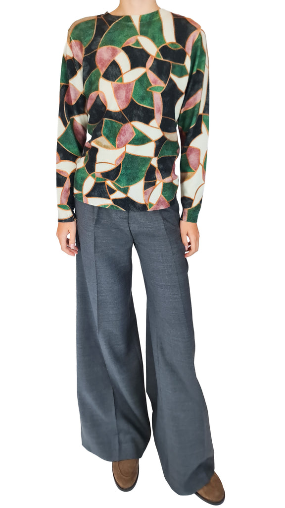 Experience versatile elegance with this Jei's sweater, crafted from pure cashmere wool for unparalleled softness and warmth. This long-sleeve crewneck features a unique double-use design, offering two distinct prints on the front and back that you can interchange effortlessly to match your mood or style. Perfect for any occasion, it combines luxury with functionality, allowing you to refresh your look without changing your sweater.