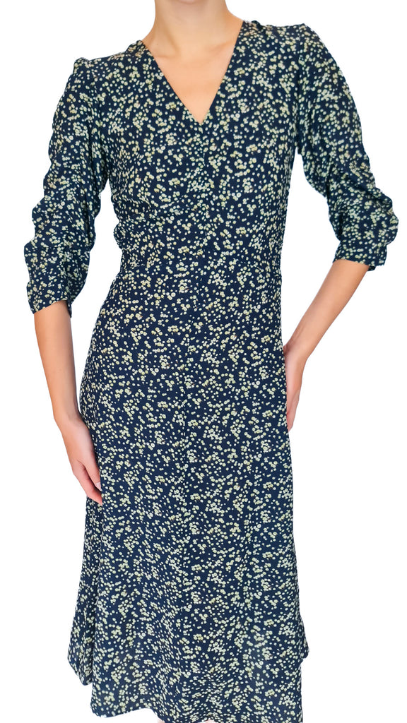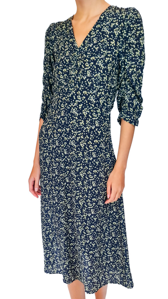 Crafted from luxurious silk, this dress showcases a v-neckline and gentle gathers at the waist and sleeves that highlight a graceful silhouette. The rich navy fabric, decorated with a refined green floral design, exudes elegance and understated beauty. Its long, flowing shape creates an effortlessly feminine and airy look.