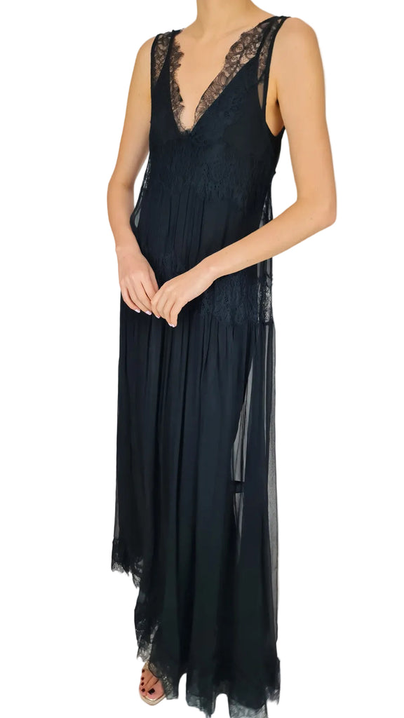 Flowing dress in black viscose chiffon, delicately sheer, adorned with bands of inset lace. The interplay of textures creates an airy and romantic look, while the separate silky modal lining ensures comfort and opacity. Its long, straight cut highlights the lightness of the fabric, and the v-neck at the front and back adds a sensual and feminine touch. An elegant and timeless piece that will flatter your figure.
